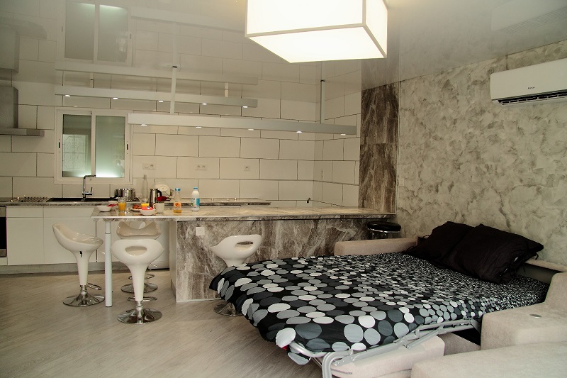La cuisine américaine ouverte sur le salon dispose d’un grand bar idéal pour cuisiner les spécialités du midi ou pour savourer un bon apéro glaçon fournie par la maison, grace au frigo (n’oubliée pas les olives). Sinon pour éviter la corvée de vaisselle a votre disposition un lave vaisselle 12 couvert qui donne la touche finale de la cuisine équiper, sans oublier la cafetière Nespresso qui vous réveillera les matins difficiles ou pas. Tous cela a la température de votre choix avec la clim.