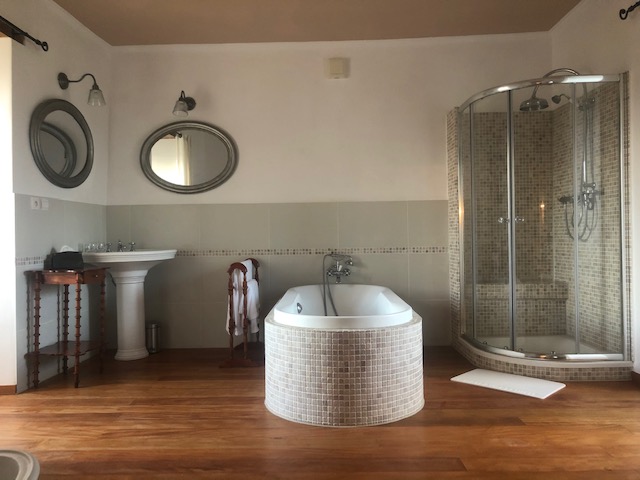 * Salle de bain privative dans la tour (relié à la chambre), baignoire sur pieds, grande douche et toilettes.
