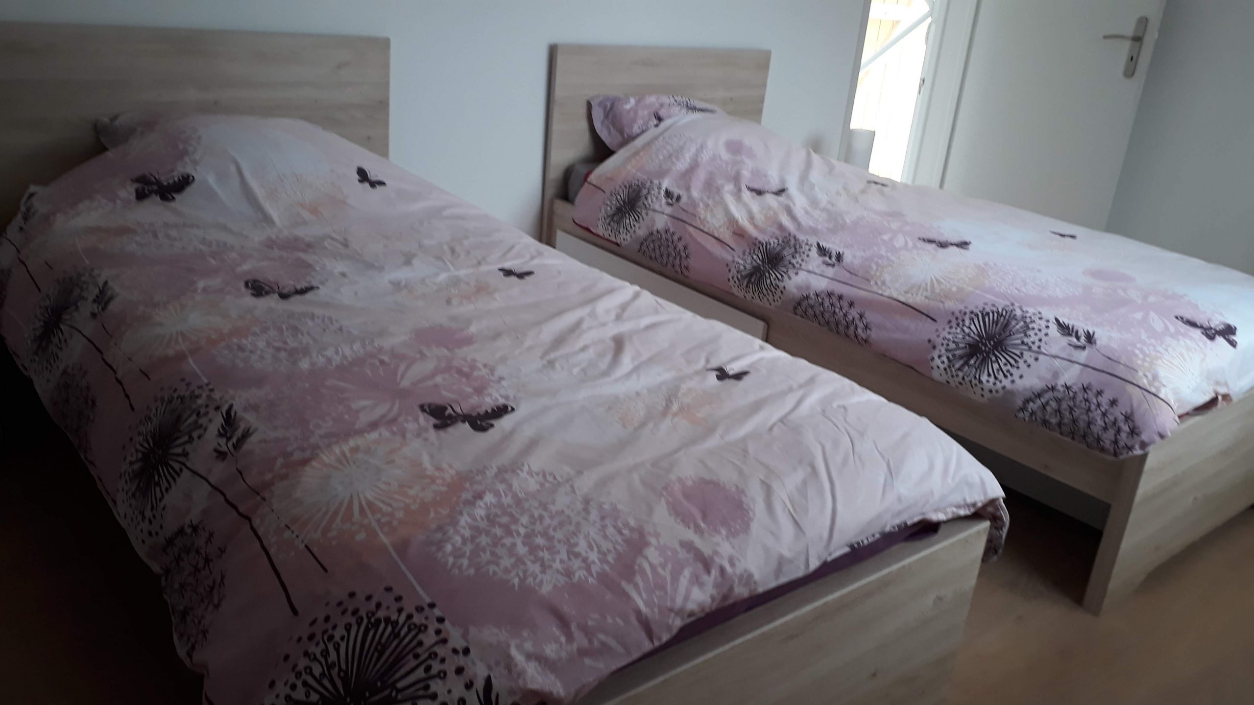 Composé d’une chambre avec lit en 160x200m avec tiroirs de rangement, commode (2 personnes), d’une chambre avec 2 lit en 90x200m avec tiroirs de rangements, armoire (2 personnes), et un canapé convertible dans le salon (2 personnes).
