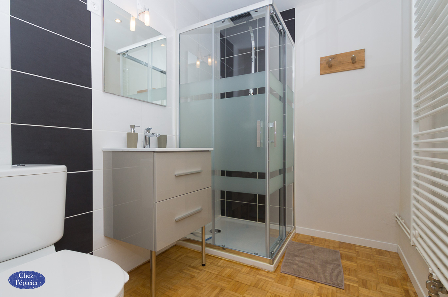 Juste à côté de cette salle vous trouverez une machine à laver et son sèche-linge, une planche à repasser et son fer ainsi que des toilettes.