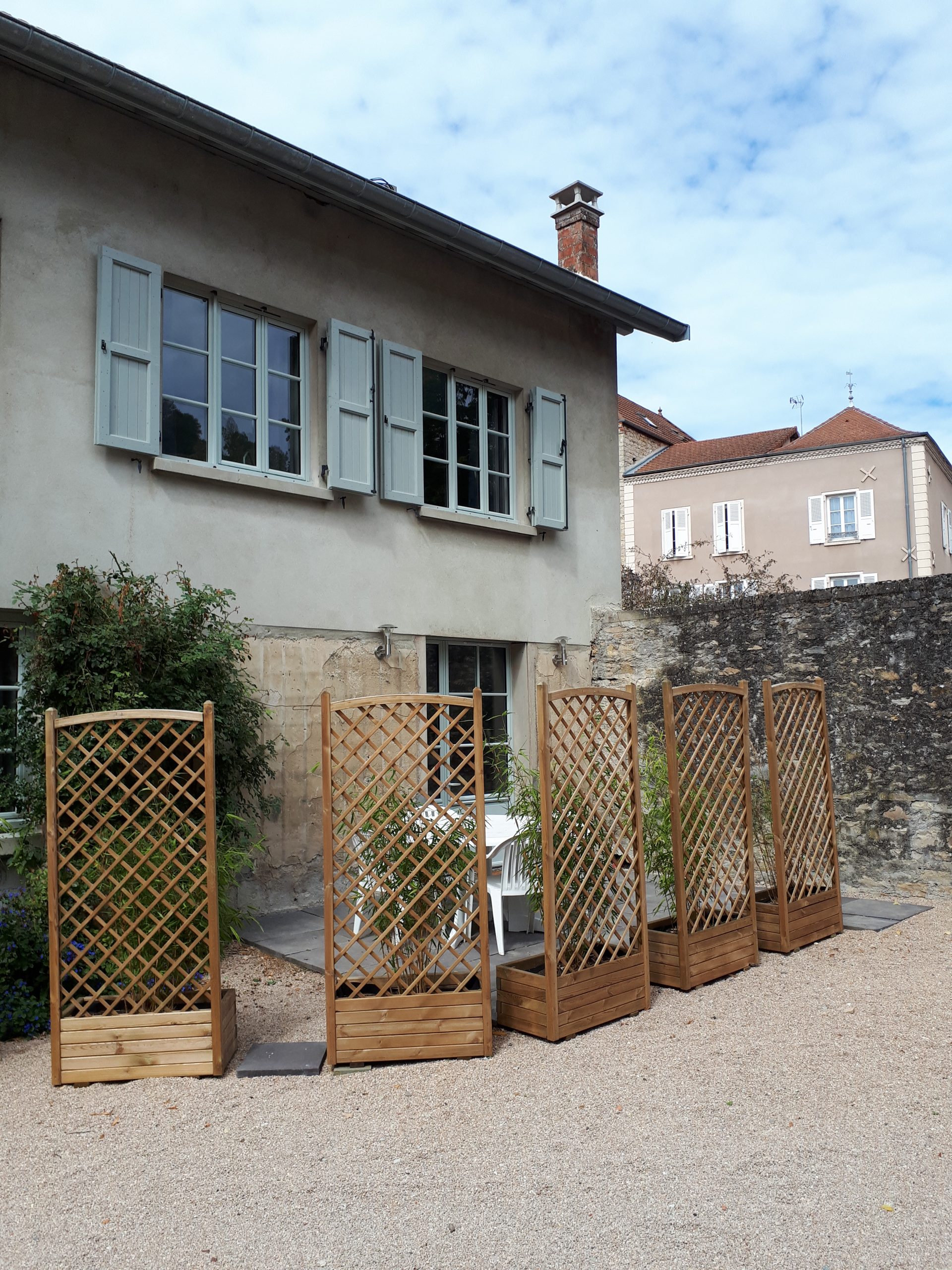 Le rez-de-chaussée donne sur une petite terrasse de plein-pied équipé d’un salon de jardin.