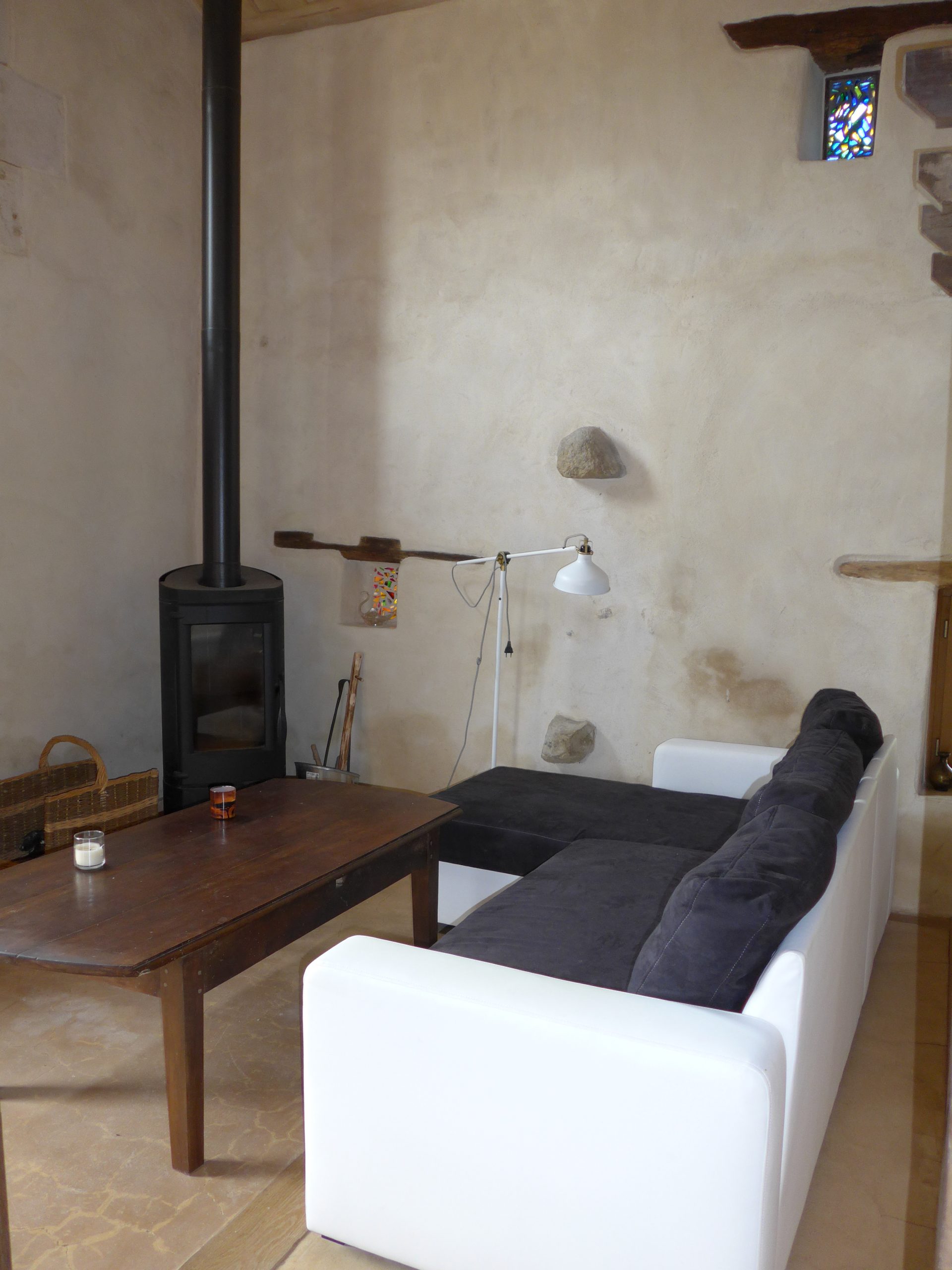 Salon : Canapé convertible, table basse, chaîne hifi, buffet, table de salon, poêle à bois. Pas de TV, mais un écran d’ordinateur à votre disposition.