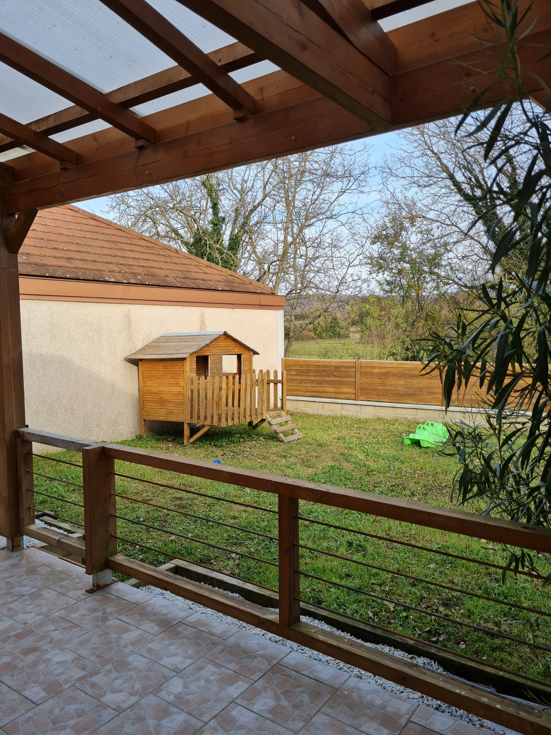 •Extérieur: donnant directement sur une grande terrasse couverte et sur le petit jardin fermé avec barbecue et table a mangé pour profiter d’un moment en pleine air. Une petite maison en bois et des jouets pour amuser les tous petits.