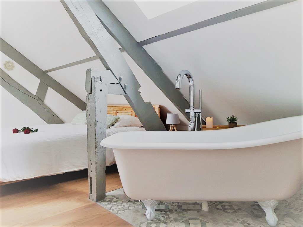 Au second étage, vous serez séduit par la suite parentale sous les combles et son lit Queensize 160, avec sa salle de bains ouverte sur la chambre. L accès à la suite parentale n est pas adapté aux enfants de moins de 6 ans.