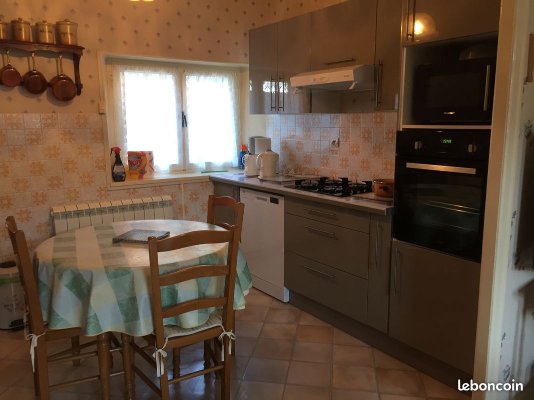 Cuisine équipée ( plaque de cuisson – four – micro ondes – lave vaisselle – réfrigérateur/congélateur ) ouverte sur pièce à vivre avec TV.