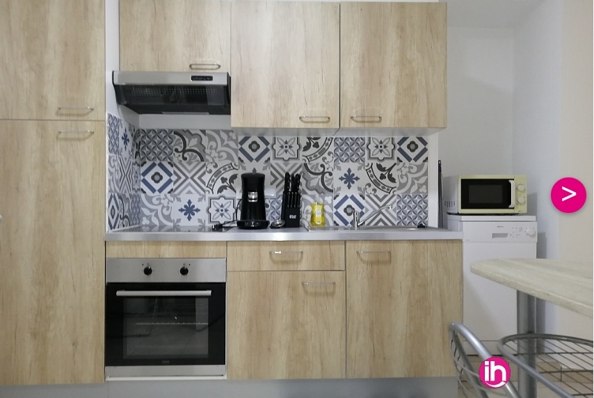 Logement composé d’une pièce à vivre contenant salon et espace repas. Une cuisine séparée, toute équipée: plaque, four, lave vaisselle, machine à laver,…
