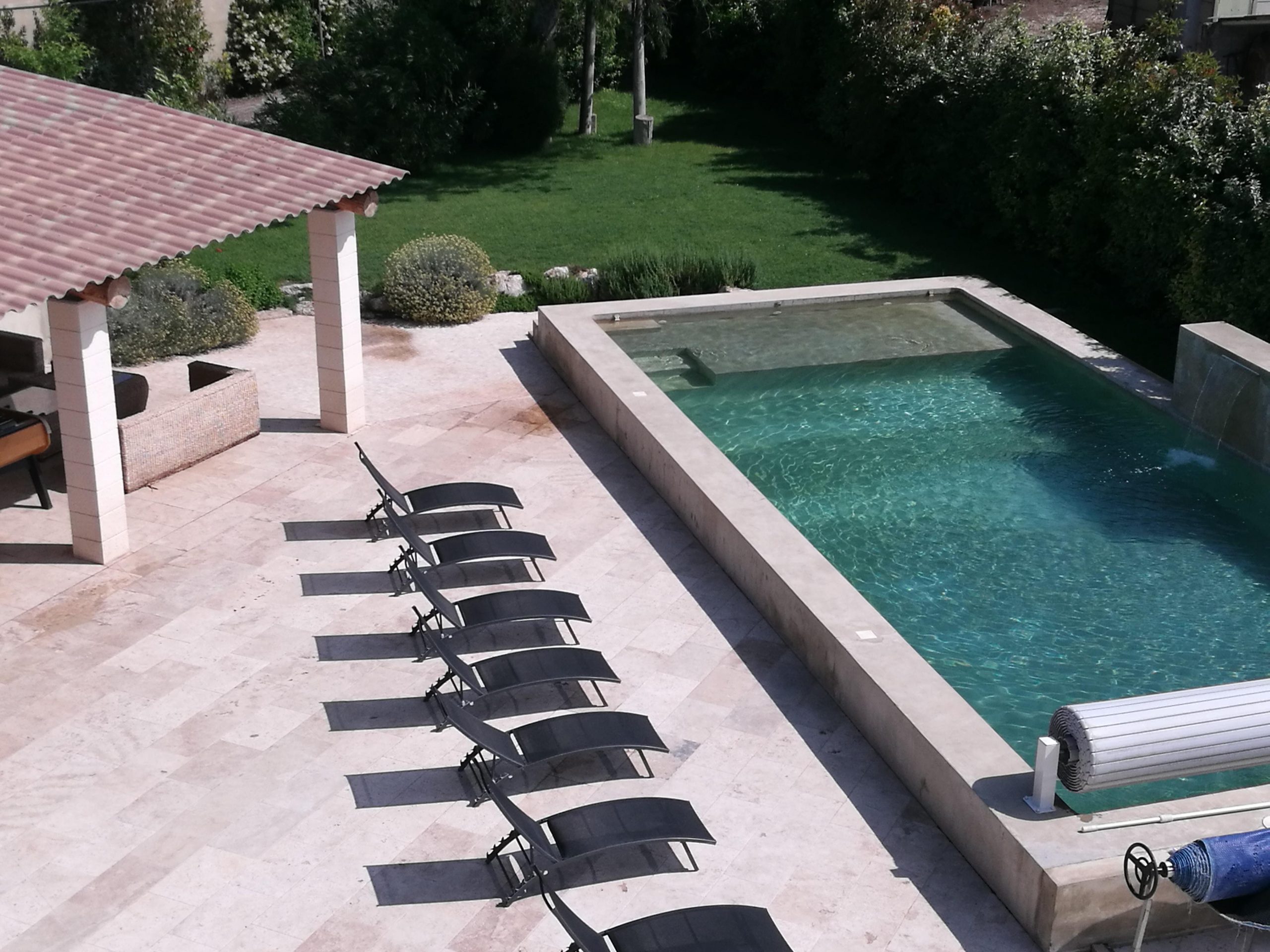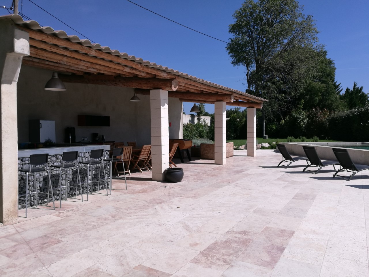 Et bien sur, notre piscine chauffée sécurisée, avec son pool house tout équipé. Coin cuisine ( lave vaisselle, évier, frigo, plancha, barbecue, machine à glaçons, etc…) coin repas, coin salon. Plancha et Barbecue de marque: La forge d Adour pour les connaisseurs….
