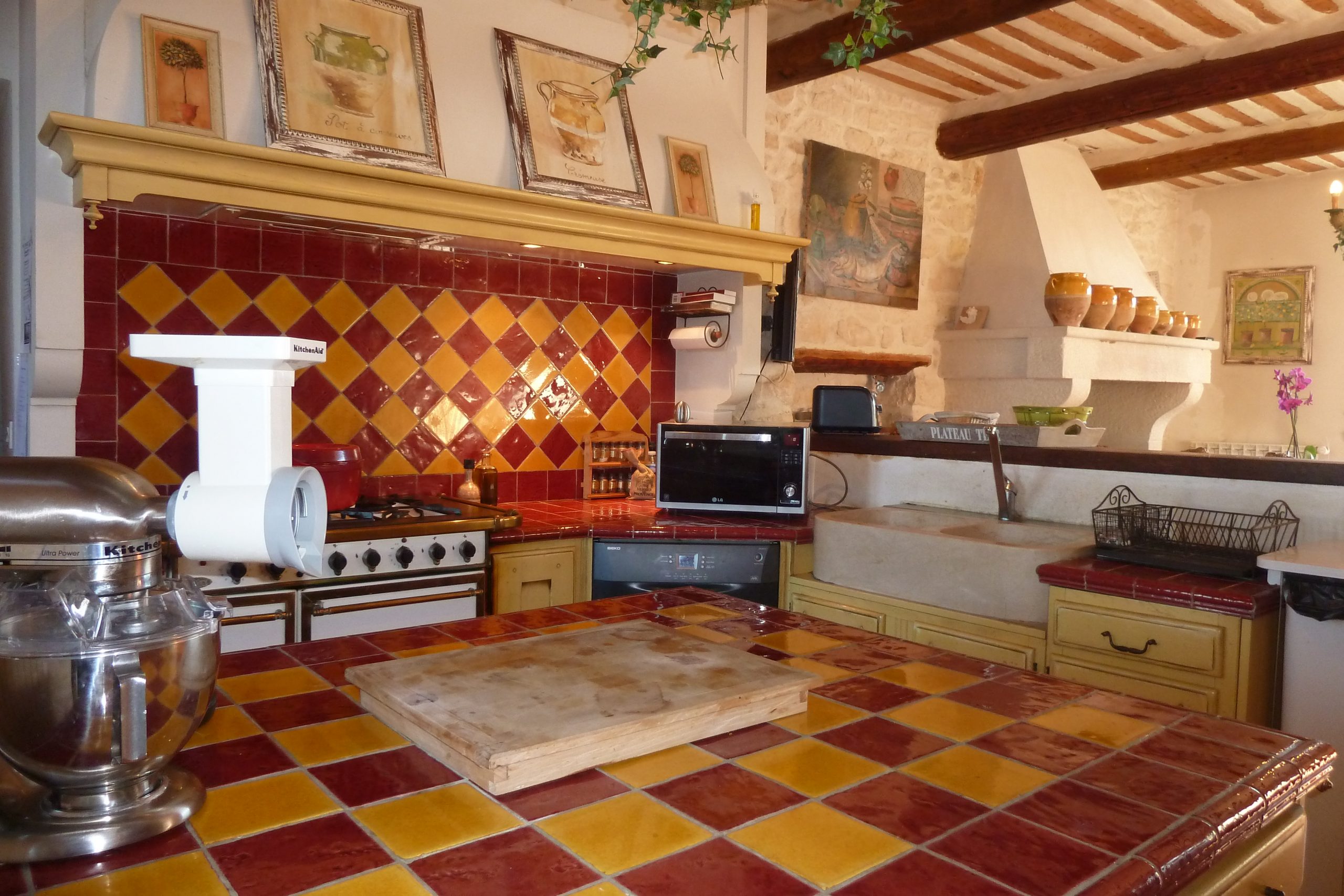 Une belle cuisine tout équipée ouverte sur un des coins repas de la maison décorée de son imposante cheminée