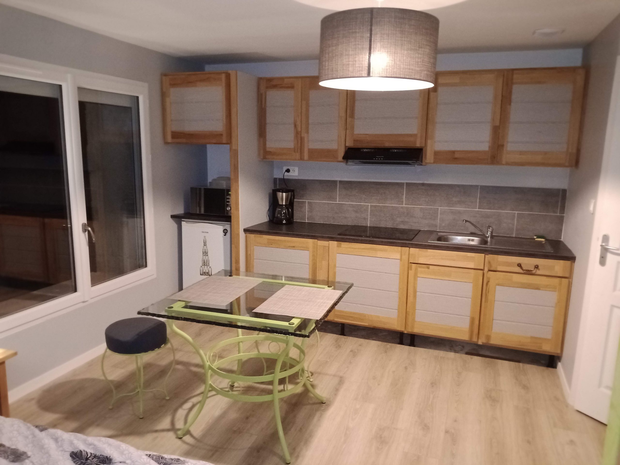 Situé au calme sur la commune de Vaux en Bugey, ce studio de 23m² est doté d’une cuisine équipé de placard de rangement, d’une plaque à induction, d’un frigo top, d’un four combi micro-onde, d’une cafetière et de toute la vaisselle nécessaire.